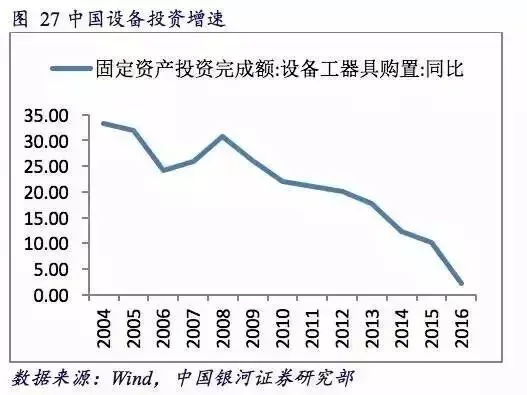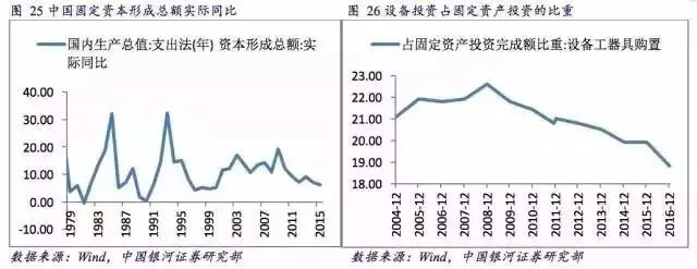 2009年中国固定资本形成增长19.1%,此后经过7年的回落,2015年降至6.1%。从设备投资的增速来看,从2008年到达30.7%高点以后不断回落,2016年全年增速只有2.1%。从设备投资占固定资产投资比重来看,中国企业资本开支持续低迷,从2008年到达最高点22.6%之后持续下跌,2016年降至18.8%。
