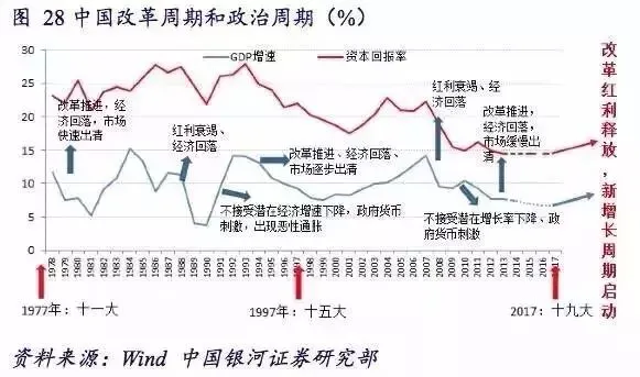 改革释放的经济周期与政治周期密切相关,因此2017年十九大召开,与1997年类似。如果国际方面没有黑天鹅事件的巨大冲击,2017年应该是改革释放周期的开始。