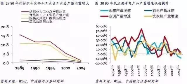 为何经济发展到这个阶段需要制度安排改革去释放经济增长潜力?这其实就是经济成长规律:纵观过去我国经济发展周期,从80年代初期第一产业发展迅速,80年代中后期开启工业化进程,第二产业开始迅速发展,解决“吃”和“穿”两个核心需求的纺织业和食品加工业快速发展。到了九十年代,随着对冰箱、洗衣机、空调、电视机之类的家电的需求提升,带动了家电产业迅速发展。