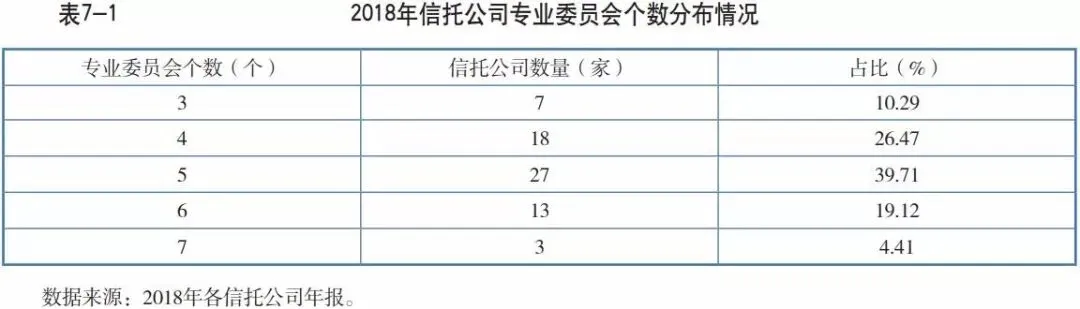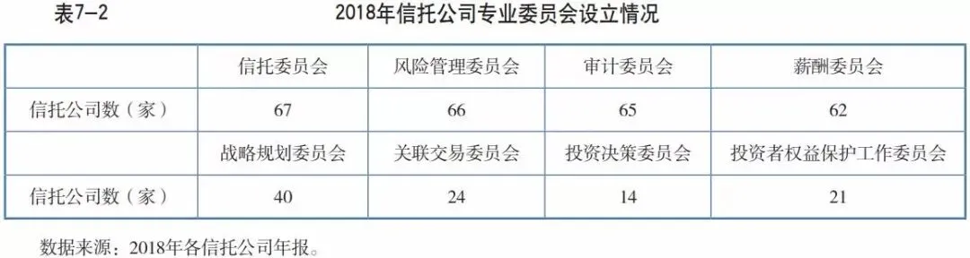 所有信托公司均在董事会下设立了各类专业委员会,这表明信托公司越来越重视科学决策的重要性,同时通过优化议事决策机制以充分调动独立董事和外部董事参事议事的积极性,从而确保决策的有效性和严谨性。信托公司2018年年报数据显示,共有67家信托公司设立了信托委员会,66家信托公司设立了风险管理类委员会,65家信托公司设立了审计委员会,62家信托公司设立了薪酬委员会,40家信托公司设立了战略规划委员会,14家信托公司设立了投资决策委员会。战略规划委员会增设数量比2017年略有上升,表明越来越多的信托公司意识到将战略规划职能交由专业委员会承担的必要性。除此之外,部分信托公司专门设立了某些委员会,如包括西藏信托、光大兴陇信托和万向信托在内的21家信托公司设立了投资者权益保护工作委员会,旨在指导、监督公司投资者权益保护工作、投资者权益培训工作、投资者教育相关工作的开展;华润信托设立信息披露委员会,负责公司年度报告和公司重大事项临时报告的披露;中航信托设立金融科技委员会,探索科技与信托的充分融合。