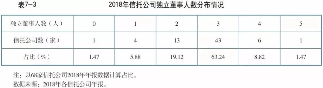 我国在2001年颁布的《关于在上市公司建立独立董事制度的指导意见》要求公司建立和完善独立董事制度。对于我国信托公司而言,董事会独立性越强,其对信托公司经营管理层发挥监督的能力就越强,越能更加客观公正地评价经营管理者的经营绩效。董事会的独立性可以由董事会独立董事的占比侧面反映出来。信托公司2018年年报数据显示,超过82%的信托公司的独立董事人数为2~3人,其中人数为3人的信托公司有43家,占比为63.24%;人数达到4人的信托公司共计6家;万向信托的独立董事人数在2017年和2018年一直为5人。