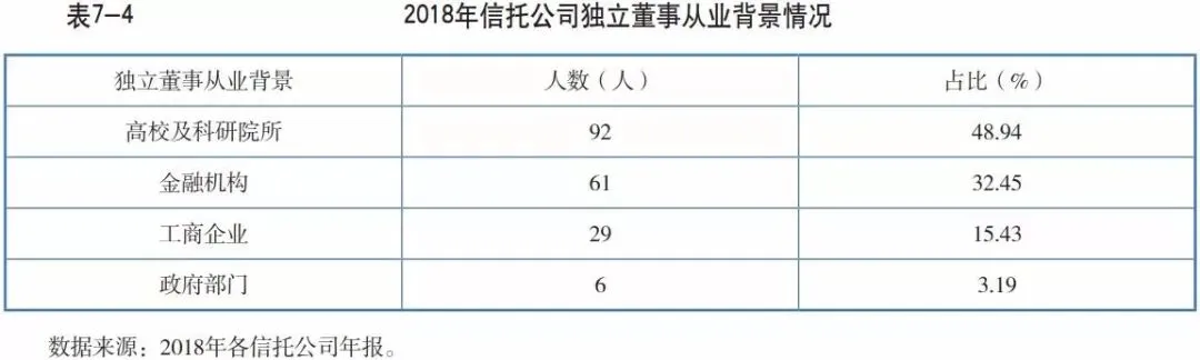 信托公司选聘的独立董事从业背景主要包括高校及科研院所、金融机构、工商企业、政府部门四类。根据信托公司在2018年年报中披露的独立董事从业经历情况,各家信托公司聘请的独立董事中具有高校及科研院所背景的合计92人,占比为48.94%,近三年均居各类从业背景首位,信托公司重视引入具有高校及科研院所背景的独立董事,旨在提高公司的创新和管理水平,同时协助信托公司树立良好形象。此外,信托公司聘请具有金融机构背景的独立董事合计61人,占比为32.45%;聘请具有工商企业管理经验的独立董事合计29人,占比为15.43%;聘请政府部门背景独立董事合计6人,占比仅为3.19%。