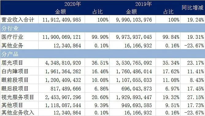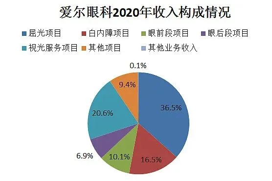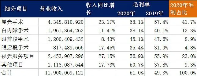 可以看出收入占比最大的是屈光项目收入43.48亿,占比36.5%,增速为23%。这也就是我们常说的近视激光手术(现在爱尔还有部分ICL的手术)。全飞秒和ICL量价齐升,这部分主要是针对青壮年。第二大的是视光服务项目24.54亿,占比20.6%,增速27.2%。是所有收入细分里面最高的。这部分和欧普康视有重合第三大就是白内障手术,收入19.6亿,占比16.5%。主要是针对中老年,现在渗透率只有发达国家的1/4,印度的1/2。2020年增速出现相对屈光和视光要慢一些。后面第4-6基本就是眼前段手术12亿、其他项目11.1亿,眼后段手术8.17亿。眼前段增速为8.4%,其他和眼后段增速为17%。眼前段手术指涉及眼球前段结构,如角膜、虹膜、睫状体、晶状体等疾病所施行的手术;眼后段手术指涉及眼球后段结构如玻璃体、视网膜等等部位疾病所进行的手术”。