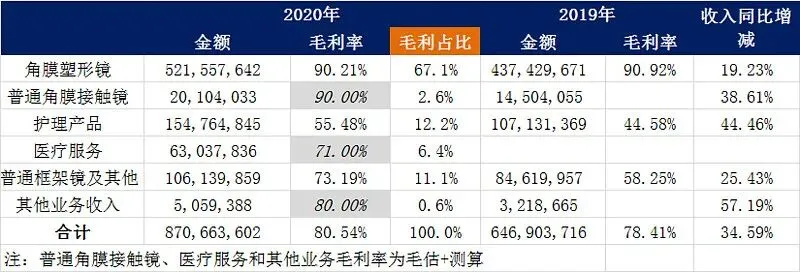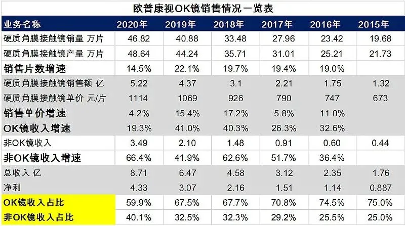可以看出OK镜产品收入仍然是公司收入大主力军,但是占比一直都有下滑,从2015年的占比75%,下滑到了2020年的60%。虽然占比有所下滑,但是OK镜收入增速仍然是可以,2020年仍然有19.3%的增速。再来看下利润占比情况