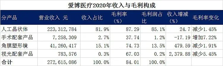 爱博医疗的收入构成非常清晰,人工晶状体收入2.23亿,占比为81.9%,2020年增速为24.7%,还是很快的。毛利率为87.29%,在集采的情况下,略有下降,但是还是很高的。根据出厂价情况,毛利率出现大幅下跌可能小比较小。毛利润占比为85.1%,比收入占比稍高。另外一块就是ok镜,收入为4126万,占比15.1%。由于产品是2019年3月获批的,看收入增速意义不大。2020年销售片数达到了10万片含试戴片,单价都快和晶状体差不多了,毛利率比晶状体还要低