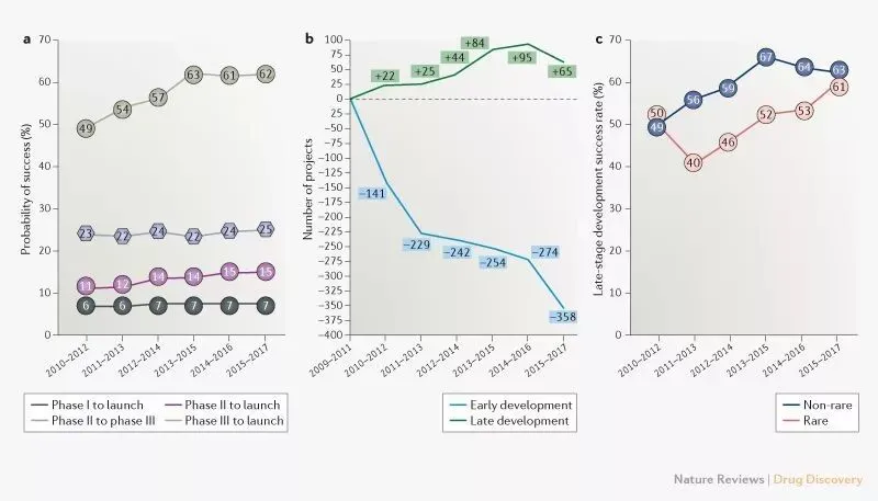 ▲2009-2017年临床开发的趋势(a,不同临床期产品开发成功率;b,早期和后期临床项目增减数目;c,孤儿药和非孤儿药后期开发成功率。图片来源:参考资料[1])