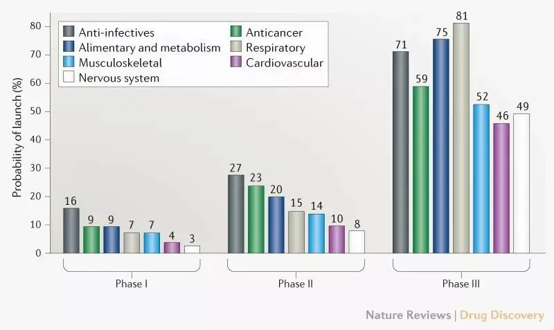 疾病治疗领域对研发成功率也有很大的影响,例如在2010-2017年间,治疗心血管和神经系统疾病的疗法开发成功率最低。而抗感染和抗癌疗法的成功率则名列前茅。