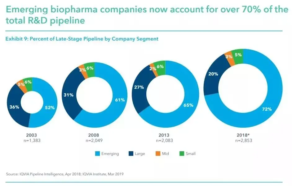 ▲新兴生物医药公司占据超过70%在研药物研发管线(图片来源:参考资料[2])