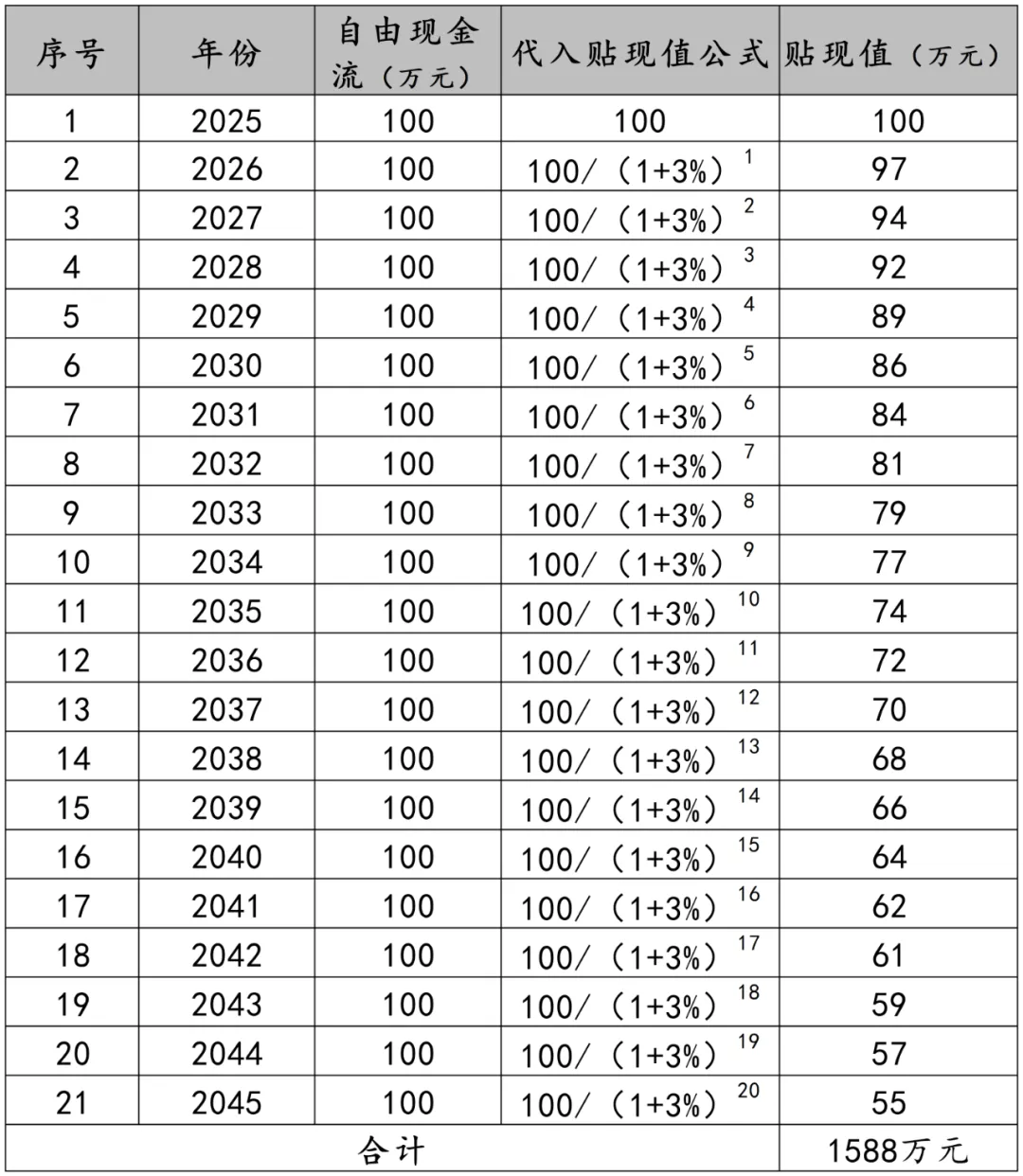 对照上述计算方法,先找企业每年的自由现金流,在2025-2045年,企业每年自由现金流都是100W,然后根据不同年份,把它贴现到当下,直接公式代入,2025年的100万还是100万,2026年得到了97万,2027年是94万,以此类推,再把一连串的贴现值求和,最后得到的结果为1588万,即自由现金流折现的估值。简言之,这个企业只要能在未来20年,维持住现状,哪怕业绩完全不再增长,也能有接近1588万的市值。