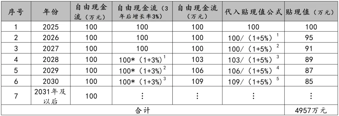 2025年、2026年、2027年,企业的自由现金流还是100万,通过贴现率公式算出这3年的贴现值分别为100万、95.24万、90.70万。但是到了2028年,企业的现金流开始以每年3%的速度增长,那就是100*(1+3%),即103万,2009年为100*(1+3%)²,即106万,然后通过贴现率公式,贴现出89万、87万,但这时候发现一个问题,企业是永续经营的,那怎么去计算后面的这些永续经营期间的所有贴现值的总和。