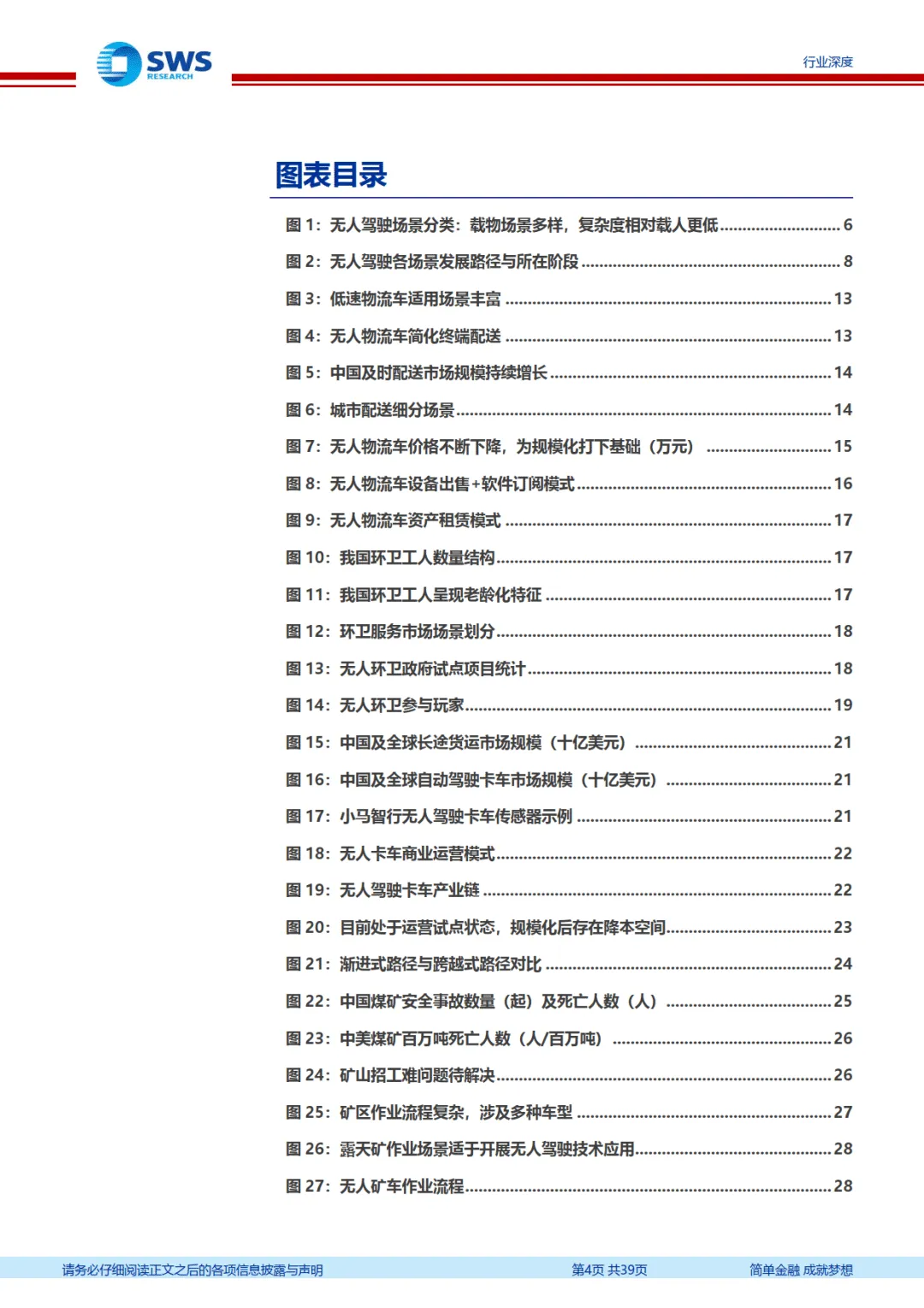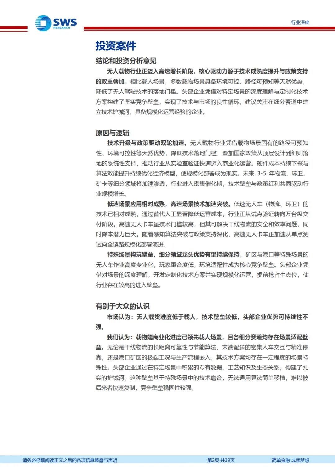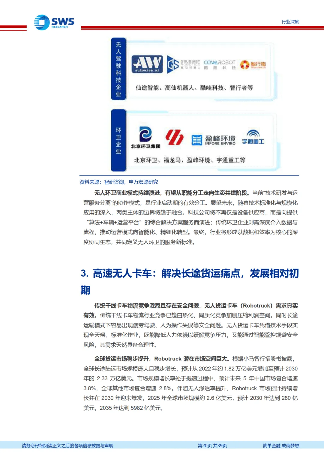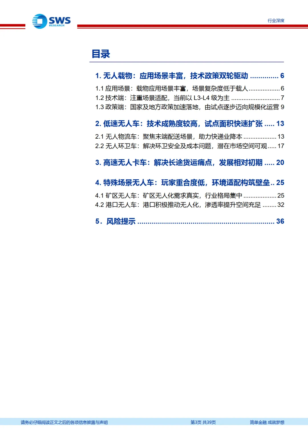 无人载物行业正迈入高速增长的规模化时刻,未来 3-5 年物流、环卫、矿卡、港口等细分领域将加速渗透。技术创新、政策支持与商业模式优化将持续驱动行业发展,具备场景适配能力与规模化运营经验的头部企业有望持续领跑,行业将逐步重构相关产业生态。