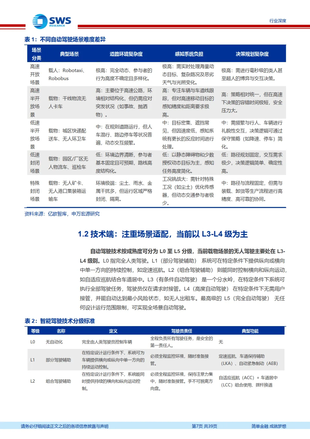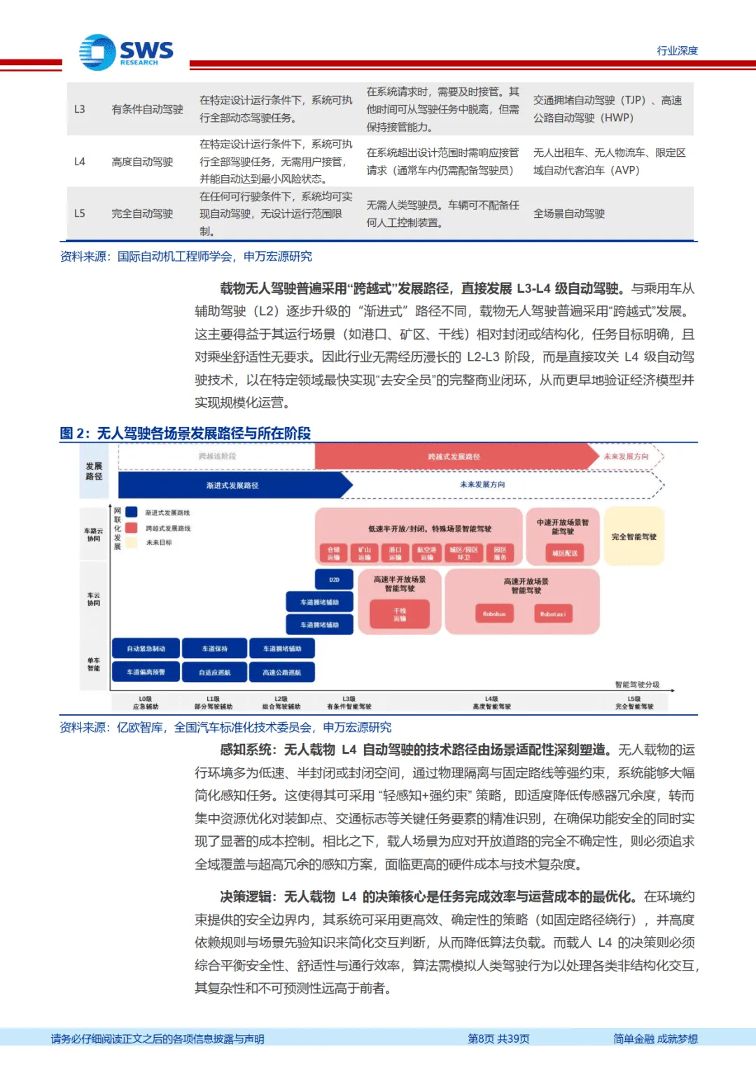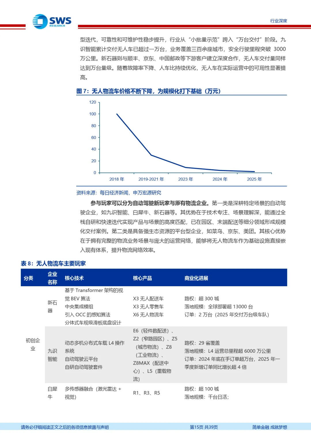 细分场景呈现差异化发展态势,低速场景率先规模化。低速无人物流车聚焦末端配送,通过替代人工实现单票配送降本 47%,九识智能、新石器等企业已实现万台级交付,行业从 “小批量示范” 迈入规模化阶段;无人环卫车解决行业老龄化、成本高的痛点,依托政府招标项目快速扩张,市场渗透率虽低但增长潜力巨大。高速无人卡车处于发展初期,技术要求更高,需应对高速开放场景的复杂变量,目前以试点验证为主,未来降本空间显著。特殊场景中,无人矿卡凭借封闭环境、固定路线优势实现规模化应用,市场格局集中,易控智驾占据领先地位;港口无人车从 AGV 向更灵活的 IGV、DCV 技术演进,特大型港口部署领先,中小型港口渗透率提升空间充足。
