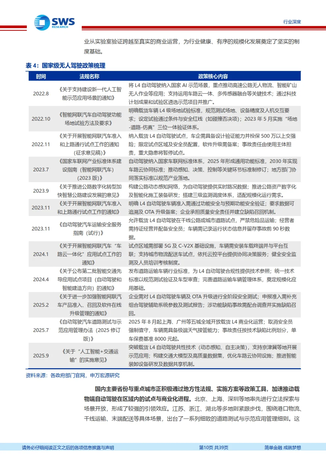 行业发展受技术与政策双轮驱动,规模化落地条件逐步成熟。技术层面,无人载物场景多具备路径可预知、环境可控、动态障碍物少等特征,技术复杂度低于载人场景,当前以 L3-L4 级自动驾驶为主,采用 “跨越式” 发展路径,硬件成本持续下探与算法效能提升优化了单位经济模型。政策层面,国家及地方密集出台支持政策,从顶层设计到落地细则构建完整框架,部分城市已全域开放载货 L4 商业化运营,取消安全员强制值守,为行业发展扫清制度障碍。