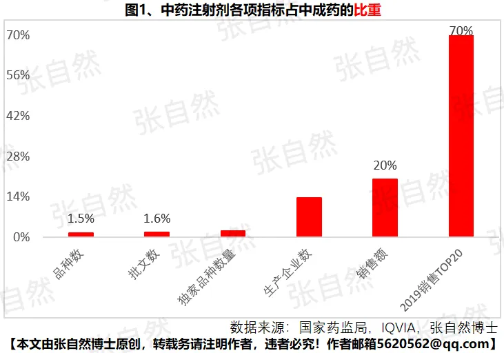 截至今天(3月6日),中药注射剂共有批准文号945个(不含类似注射用穿琥宁等冠以“H”开头并被归为化药的部分中药注射剂),仅占中成药批文总数59632的1.58%,生产企业数也只占中成药的14%,但中药注射剂销售额却占了整个中成药的20%,TOP20大品种占比更是高达中成药的70%(图1),更不用说中药注射剂所成就的上市公司之众了,所以,在中药领域,中药注射剂的影响不可小觑。