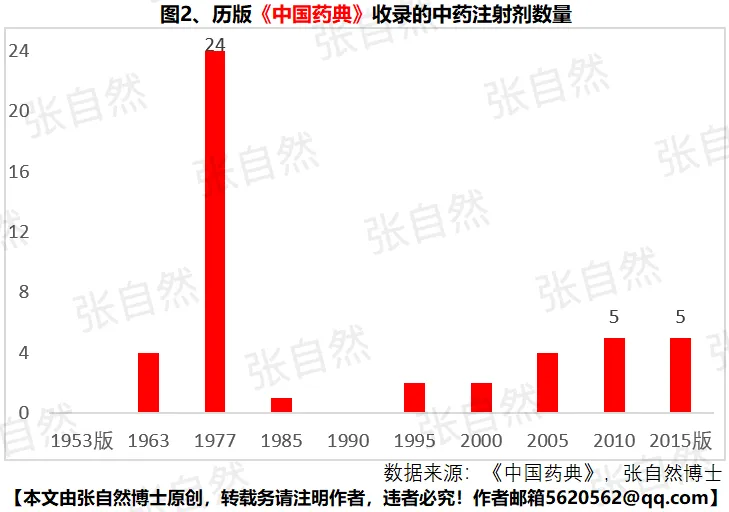 2000版首次收录中药注射剂冻干粉(双黄连粉针剂),目前仍在执行的2015版《中国药典》收载了清开灵等5种中药注射剂(图2)。