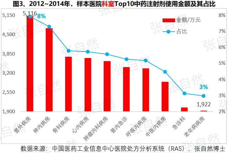 通过对2012-2014年样本医院的用药分析,可见,中药注射剂还主要在西医住院病房使用,且普通外科病房用的最多,占了总量的8%,其后依次是神经内科病房(7%)、骨科病房(6%)、心血管内科病房(6%)、肿瘤内科病房(6%)(图3)。