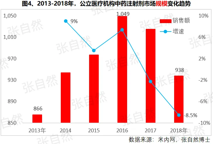 2015年以来,中药注射剂相继被各地纳入辅助用药目录,中药注射剂的市场规模增速随之下降,全国公立医疗机构的中药注射剂市场规模已由高峰时2016年的1049亿元,下降到了2018年的938亿元(图4)。