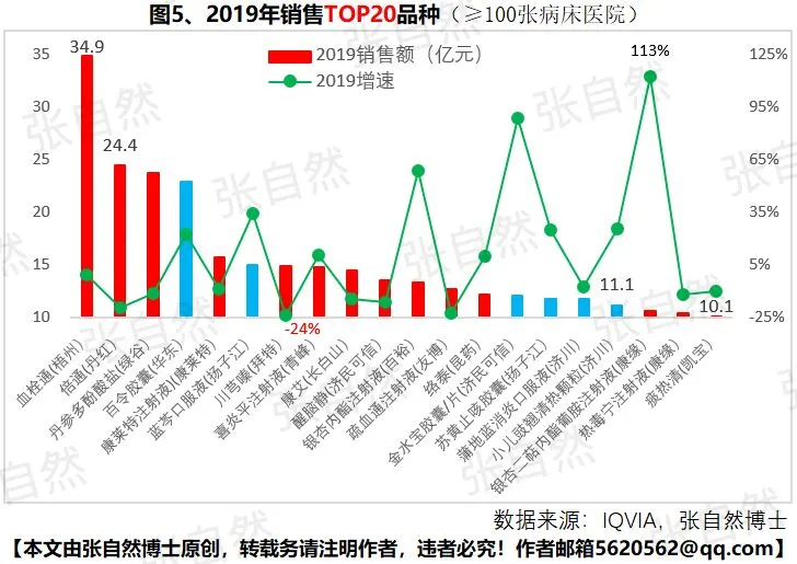 2019年百床及以上医院中成药TOP20排名第一的是梧州制药的注射用血栓通34.86亿元,但其增速已持续下降到了-0.46%,其次是丹红注射液为24.42亿元,增速最快的是近年新上市的江苏康缘药业的银杏二萜内酯葡胺注射液,去年销售了10.6亿元,增速高达112.8%(图5)。