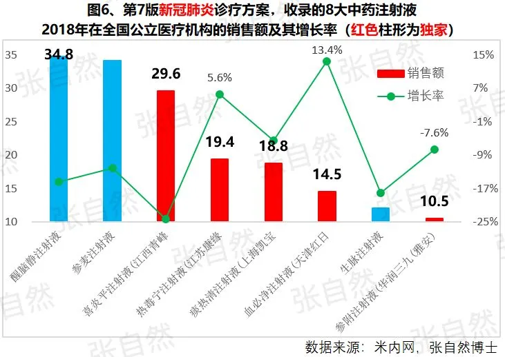 新冠肺炎爆发后,国家及各地陆续发布了多版诊疗方案,并且都收录了中药,其中,也包含中药注射剂,而前天国家刚下发的《新型冠状病毒肺炎诊疗方案(试行第七版)》更是包含多达8个中药注射剂,其中,有5个还是独家(图5)。