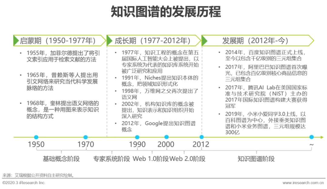 知识图谱发展至今可以总结为三个时期和五个阶段。1950-1977年是启蒙期,包含了基础概念阶段和专家系统阶段的开端,这一时期文献索引的符号逻辑被提出并且应用;1977-2012年是知识图谱不断演变的成长期,包含了大部分专家系统阶段和Web 1.0和2.0阶段,在此期间出现了很多如WordNet、Cyc、Hownet等大规模的人工知识库,知识工程成为了人工智能重要的研究领域,2012年,Google正式提出的知识图谱概念,开启了现代知识图谱的序章;2012年至今是知识图谱的发展期,中国企业开始入局,以BAT为代表的科技公司依托自身业务,在搜索引擎、电商、医疗等领域开始应用知识图谱技术,解决办法服务商们也从大数据赛道中脱颖而出,将知识图谱技术拓展到安防、金融、教育等更多领域,让AI跳出感知智能的商业局限,向解决各产业生产环节中的核心痛点更进一步。