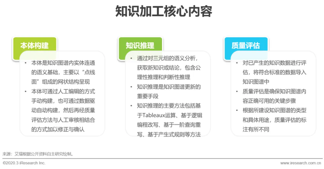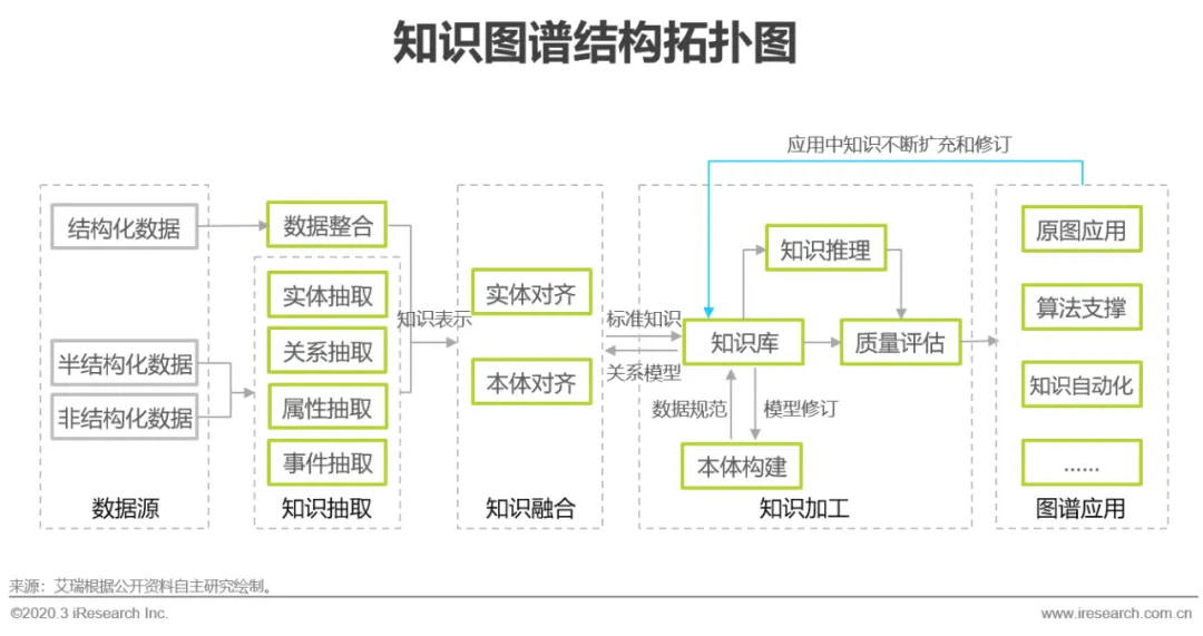 知识图谱从逻辑上可以分为概念层和数据层,数据层指以三元组为表现形式的客观事实集合,而概念层是它的“上层建筑”,是经过积累沉淀的知识集合。建设中以本体模型和实体数据库为核心,根据二者的建设顺序又分为先定义本体和数据规范,再抽取数据的“自顶向下型”和先抽取实体数据,再逐层构建本体的“自底向上型”两种模式,前者适用于场景较为固定,存在可量化行业逻辑的领域,如金融、医疗、法律等;后者适用于新拓展的,有大量数据积累,行业逻辑难以直接展现的领域。总体而言,搭建知识图谱从数据源开始,经历了知识抽取、知识融合、知识加工等步骤。原始的数据通过知识抽取或数据整合的方式转换为三元组形式,然后三元组数据再经过实体对齐,加入数据模型,形成标准的知识表示,过程中如产生新的关系组合,通过知识推理形成新的知识形态,与原有知识共同经过质量评估,完成知识融合,最终形成完整形态上的知识图谱。