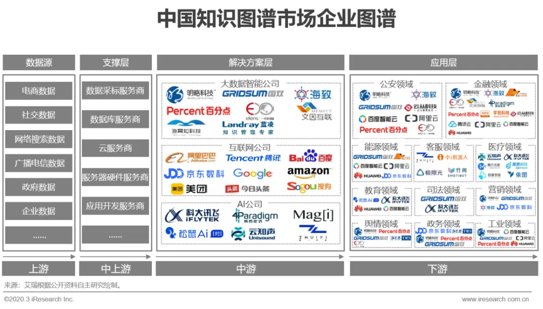 中游解决方案提供方进行全流程服务,是产业链核心环节,中国知识图谱市场产业链上游主要以各类数据源企业或机构为主,因所处理数据多具有敏感性和专属性,所以往往数据源也是服务的需求方;中上游主要包括数据采集服务商、数据库服务商、云服务商等,为产业链做支撑服务,但涉及保密数据采集加工的业务更多交由解决方案提供方直接处理;中游主要以提供知识图谱解决方案的大数据智能公司、互联网公司和AI公司为主,该部分是产业链的核心环节。其中大数据智能公司多脱身于大数据公司,凭借多年数据服务积累,在具体领域中具有先发优势和工程落地经验,随着市场对于认知智能需求的觉醒,近些年越来越多的大数据公司开始向知识图谱做技术拓展。互联网公司多以巨头企业为主,因其综合服务能力强、具有生态优势等因素,在资源调动和承接整体解决方案方面具有优势。AI公司主要以机器学习能力、NLP能力切入知识图谱市场,在技术创新和算法应用开发方面具有优势;下游为基于知识图谱而开发应用的各类具体场景应用,知识图谱应用在中国刚刚起步,主要聚焦于图中展示领域,随着市场推进将辐射更多行业。