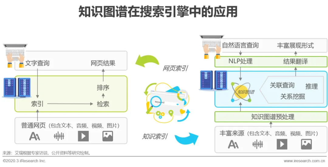 搜索引擎是互联网发展中最具代表性的应用之一,它解决了人们如何方便获取信息的问题,一度成为大部分流量的入口。但随着网络中信息沉积越来越多,人们真正需要的,隐藏在大量无用信息中有价值的部分,我们称之为知识的内容,往往得不到直观展现,这成为了搜索引擎领域重点要解决的问题。2012年5月,谷歌率先提出知识图谱概念,用以更好的描述现实世界中实体关联性问题,进而提高信息搜索中的知识获取效率,随后搜狗、微软、百度纷纷推出相关概念架构,知识图谱被视为下一代搜索引擎的核心技术。传统搜索引擎一般采用网页索引,按照“网页--(预处理)--> 临时库 --(索引)--> 索引好的库 --(由用户行为触发检索)--> 为用户展示网页结果”的流程执行,信息源来自网页,展现内容也是网页链接。而基于知识图谱的搜索作为和网页索引同级、并行的另一套知识索引,更注重信息间的关联性和自然语言理解,通过图存储的形式从新组织互联网中的信息,再以人类的语言习惯进行查询和展现,从而提高搜索体验,因为知识的存储形式发生了变化,所以知识索引信息来源和展现载体都不再局限于网页文字,语音交互和更加丰富的IoT场景将会是未来的发展方向。