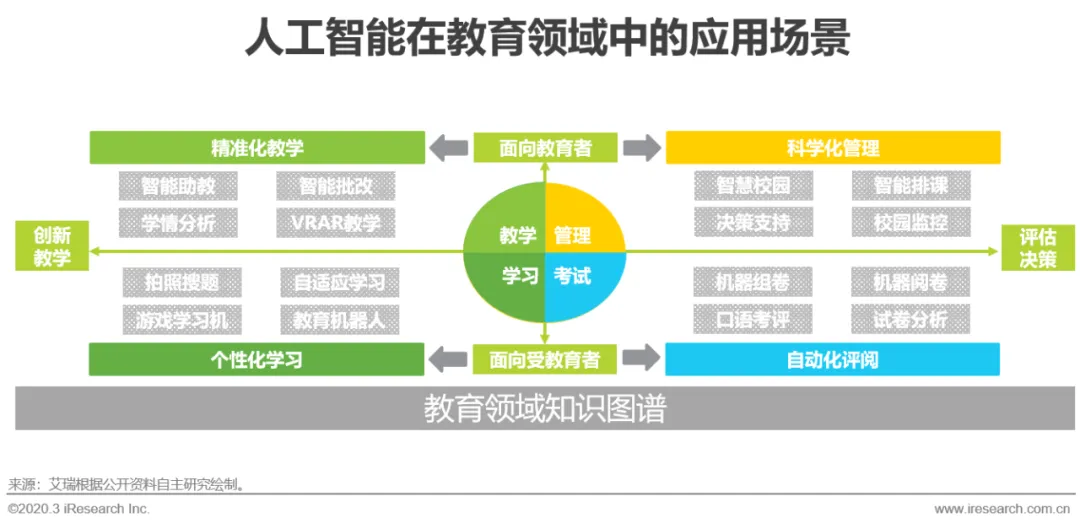 当前的教育场景可以划分为教、管、学、考,主要围绕教育者和受教育者进行授课、答疑、阅卷和学习、练习、考试等活动,本质上是通过系统化的知识传授与强化练习,使受教育者掌握知识点的过程。传统教育模式以教师集中授课为主要方式,存在着特级教师资源少、优质教学资源分配不佳、教学内容和教学节奏制式化,以及作业练习布置缺乏个性化等问题。在教育信息化和线上教育发展普及之后,AI+教育的概念随之产生,人工智能公司和教育机构希望通过利用AI技术部分解决上述痛点,以达到对教育参与者减负增效的目的,但因为教育领域参与个体众多,采集到的数据驳杂且零碎,难以直接有效应用,所以目前AI技术更多应用在如拍照搜题、口语评测、课堂监控等外围需求的工具上面,并未能有效深入到教学场景中。而类似课题推送等应用更多是将教学资源再分配,重视知识的点状强化练习,却不深究知识的掌握程度,以至实际使用者反馈平平。人工智能技术真正产生生产价值,一定要建立在充分且必要的数据基础上,搭建贯穿教材知识体系、教学资源管理和受教育者学习轨迹的知识图谱,将教与学的全过程进行可视化展现,使静态知识点数据与动态教学活动(如考试、作业等)数据产生关联,为算法应用提供支撑环境,是AI+教育能落地到产业核心的关键前提。