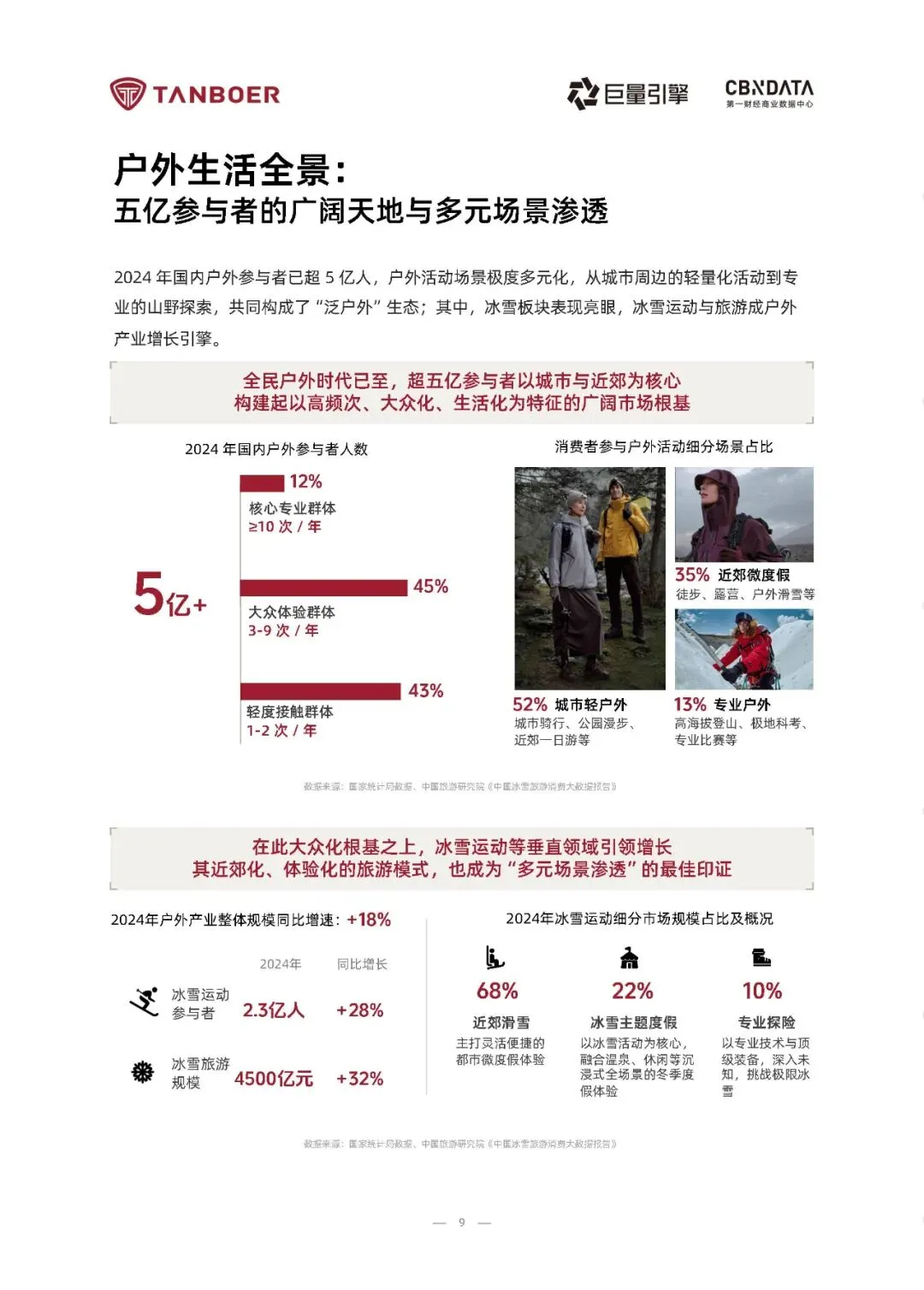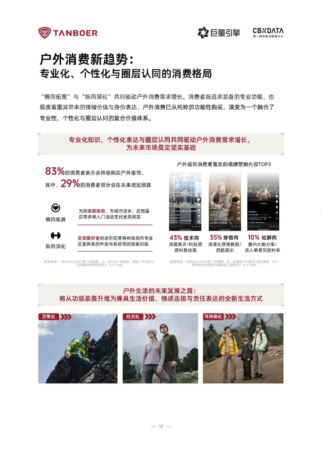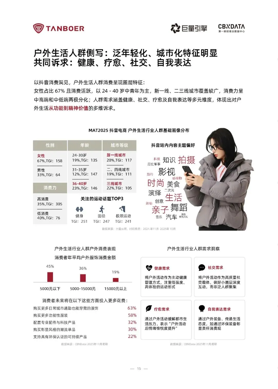 2025年《户外生活方式白皮书》揭示了一个深刻转变:户外已从小众探险演变为超五亿中国人日常生活的一部分。在“全民健身”与“三亿人上冰雪”等国家政策推动下,户外活动实现高频化、近郊化与生活化,形成以城市轻户外(52%)、近郊微度假(35%)和专业户外(13%)为支柱的“泛户外”生态。尤其值得注意的是,冰雪运动成为增长引擎,2024年参与者达2.3亿人,市场规模突破4500亿元,展现出强劲的消费动能与场景融合力。报告指出,户外消费逻辑正经历结构性升级——从单一功能需求转向“品质+场景+价值观”的复合价值体系。消费者不仅关注服饰的耐用性与科技性能,更看重其能否无缝融入通勤、社交与休闲等多元场景,并体现环保理念与个性表达。数据显示,96%的用户会在日常穿着户外功能性服饰,63%愿为“城市通勤也能穿”的产品增加支出。抖音电商中户外服饰销售规模同比增长49%,客单价提升成为主要驱动力,印证了消费升级与情感认同的双重加持。基于深度人群洞察,报告提炼出三大典型户外生活姿态:“都市乐活派”追求疗愈与时尚平衡,“山野探索家”注重装备的全能与可靠,“极限挑战者”则聚焦专业背书与极端环境防护。这种圈层化、场景化的细分趋势,要求品牌摒弃“一刀切”策略,转而提供精准匹配不同体验阶段的产品解决方案。坦博尔等领先品牌已通过轻量系列、高性能冲锋衣、滑雪及极地联名产品,构建覆盖全场景的装备矩阵,实现从城市绿地到冰川雪原的无缝守护。完整版报告已上传至星球,扫下方优惠券加入即可下载所有报告免责声明:以上报告均系本平台通过公开、合法渠道获得,报告版权归原撰写/发布机构所有,如涉侵权,请联系删除;资料为推荐阅读,仅供参考学习,如对内容存疑,请与原撰写/发布机构联系。