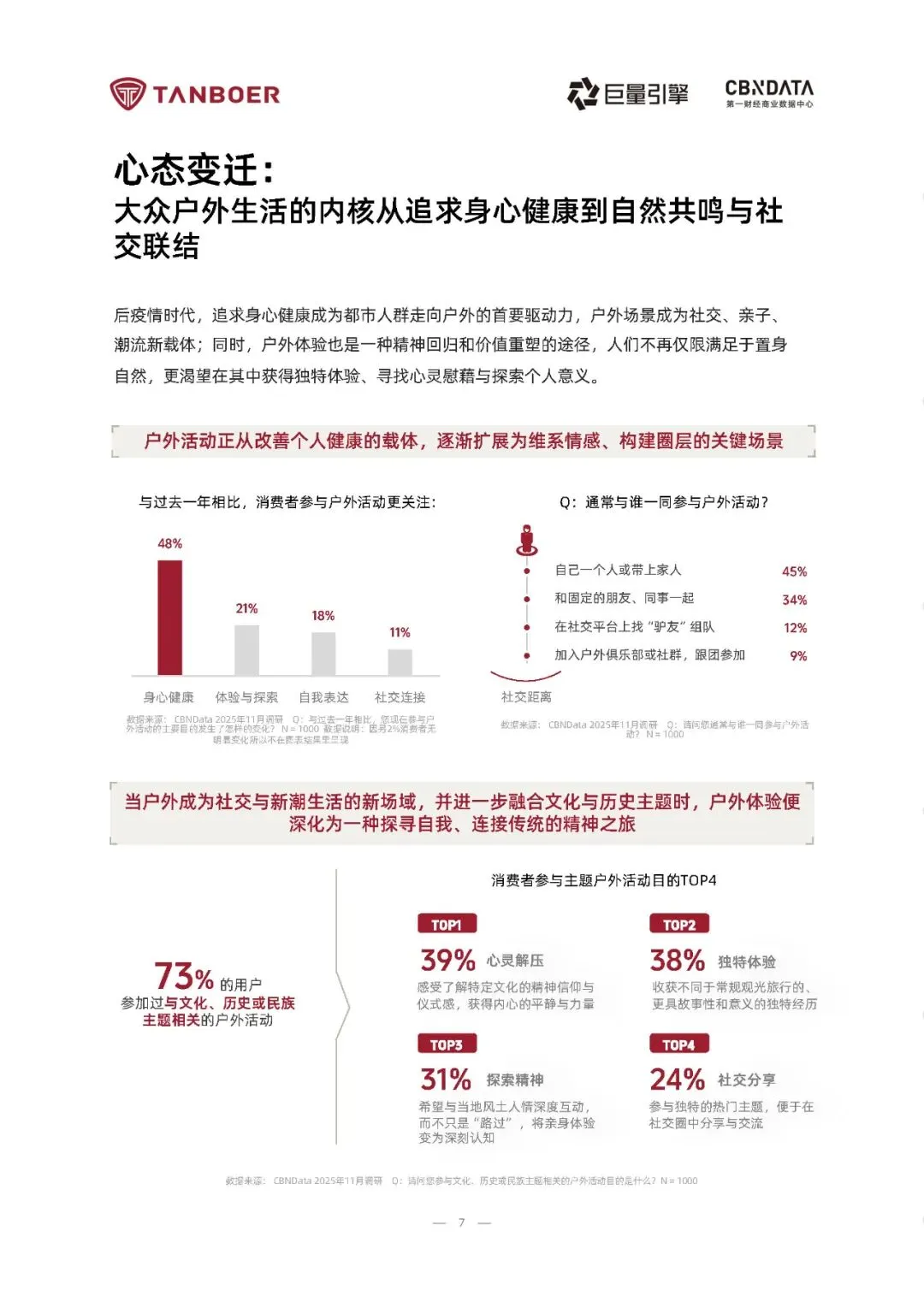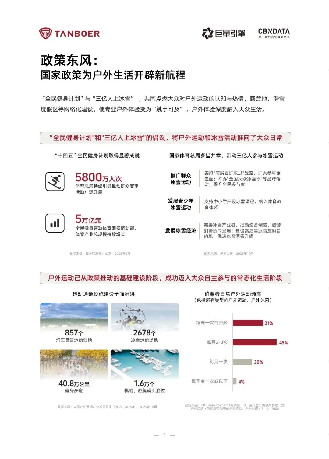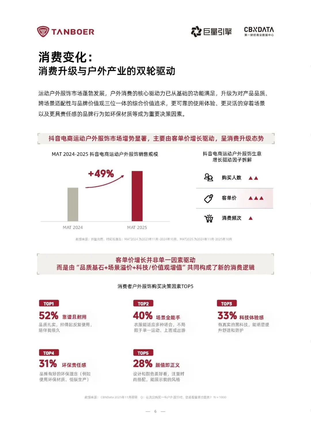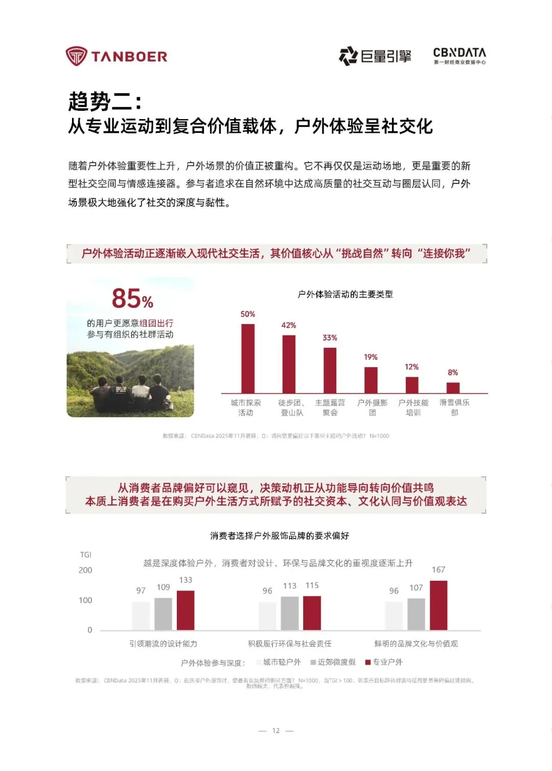 2025年《户外生活方式白皮书》揭示了一个深刻转变:户外已从小众探险演变为超五亿中国人日常生活的一部分。在“全民健身”与“三亿人上冰雪”等国家政策推动下,户外活动实现高频化、近郊化与生活化,形成以城市轻户外(52%)、近郊微度假(35%)和专业户外(13%)为支柱的“泛户外”生态。尤其值得注意的是,冰雪运动成为增长引擎,2024年参与者达2.3亿人,市场规模突破4500亿元,展现出强劲的消费动能与场景融合力。报告指出,户外消费逻辑正经历结构性升级——从单一功能需求转向“品质+场景+价值观”的复合价值体系。消费者不仅关注服饰的耐用性与科技性能,更看重其能否无缝融入通勤、社交与休闲等多元场景,并体现环保理念与个性表达。数据显示,96%的用户会在日常穿着户外功能性服饰,63%愿为“城市通勤也能穿”的产品增加支出。抖音电商中户外服饰销售规模同比增长49%,客单价提升成为主要驱动力,印证了消费升级与情感认同的双重加持。基于深度人群洞察,报告提炼出三大典型户外生活姿态:“都市乐活派”追求疗愈与时尚平衡,“山野探索家”注重装备的全能与可靠,“极限挑战者”则聚焦专业背书与极端环境防护。这种圈层化、场景化的细分趋势,要求品牌摒弃“一刀切”策略,转而提供精准匹配不同体验阶段的产品解决方案。坦博尔等领先品牌已通过轻量系列、高性能冲锋衣、滑雪及极地联名产品,构建覆盖全场景的装备矩阵,实现从城市绿地到冰川雪原的无缝守护。完整版报告已上传至星球,扫下方优惠券加入即可下载所有报告免责声明:以上报告均系本平台通过公开、合法渠道获得,报告版权归原撰写/发布机构所有,如涉侵权,请联系删除;资料为推荐阅读,仅供参考学习,如对内容存疑,请与原撰写/发布机构联系。