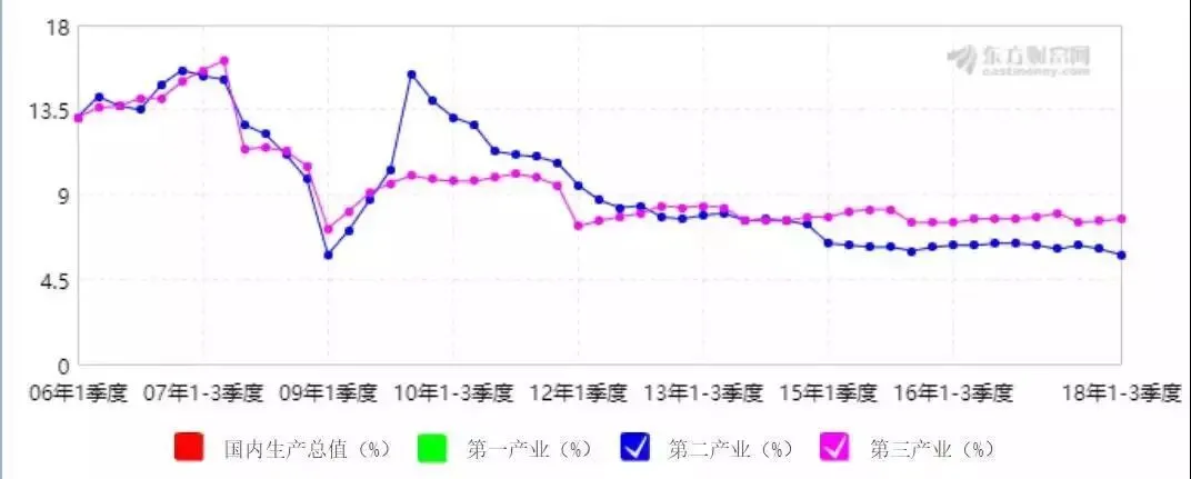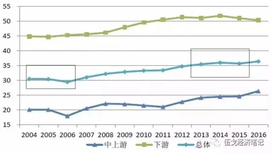 (以下游为主的第三产业与以上中游为主的第二产业波动对比)