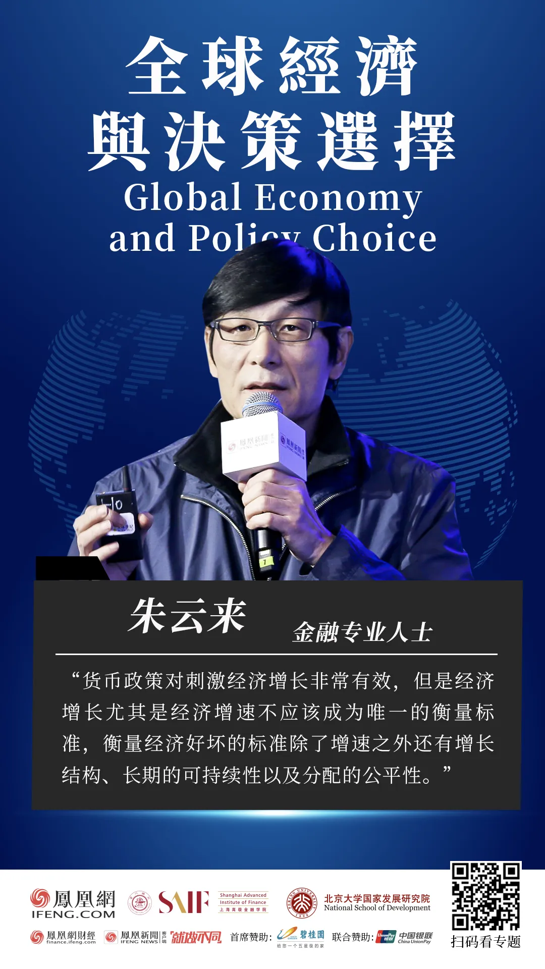 2020年,新冠肺炎疫情肆虐全球,世界经济陷入停摆。这是一场史无前例的全球危机,全球经济正面临着需求供给双重冲击,任何经济体都难以独善其身。值此变局关键时刻,凤凰网财经联合上海交通大学上海高级金融学院、北京大学国家发展研究院以“全球经济与政策选择”为主题,邀请政商学企界嘉宾通过线上形式解析全球经济面临的机遇与挑战。在5月7日的凤凰连线中,金融专业人士朱云来谈及近期肆虐的疫情对各国的经济影响时表示,各国政府需要考虑并区分两个基本概念:一个是社会赖以生存的基础需求的供应体系,其中包括必要的食品、药品以及日常生活用品等;他指出,由于疫情期间的隔离、封城等措施给基础的供应体系带来了压力,如果仅仅依靠市场自行重新组织供应的话,效率可能会比较低,因此最佳的方式应该是由政府积极地参与组织基础供应的体系。“通过中国前期的实践可以看出,中国已经做了很多这样的工作,一个系统性的体系,能够让大众生活有基础保障,也让大众能有安全的稳定的心态。”朱云来表示,另一方面还需要继续实施必要的财政政策。他指出,由于受疫情影响,实际上整个供应链以及经济发展的每一个环节都同时陷入了停滞;“某种意义上说这是不可抗力;所以除了货币政策以外,政府还可以考虑采取一些其它的措施,比如债务缓期等。”朱云来认为,整个经济周期的运转就像一辆自行车,如果不断地骑就倒不了,只要一停下车就会倒掉,经济就会随之出现支付问题。但他也坦言,现在的情况跟过去因为经济运转出现错误导致信用损失的情况不同,“只要疫情缓解了以后重新开始营业,仍然会有挣钱的能力,因此债务缓期可能会比简单的增加贷款货币宽松更加有效。”席间朱云来还强调,货币政策对刺激经济增长非常有效,但是经济增长尤其是经济增速不应该成为唯一的衡量标准,衡量经济好坏的标准除了增速之外还有增长结构、长期的可持续性以及分配的公平性。朱云来说道,“综合近期和长期的情况来看,要应对短期内新冠肺炎疫情带来的冲击,政府可以起到一个非常积极的引导作用,例如通过政府组织社会供应、保证社会基本运转等等;当然必要的财政货币政策也需要用来支持这一过程。”