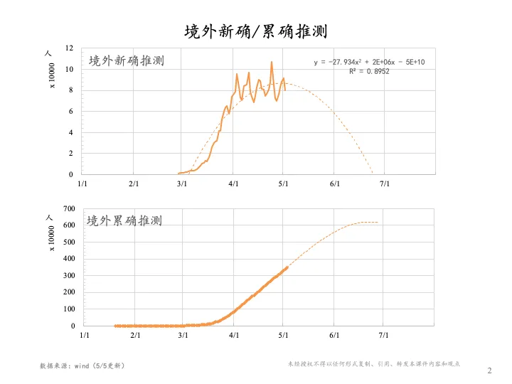 从这个图上红色这条线可以看出来,中国最早开始爆发疫情的时间主要是从1月底到2月初,还是比较快地得到了控制;如果我们再看中国以外的国际的情况,也就是新确(新增确诊病例)、累确(累计确诊病例)两图图中蓝色的线,就会发现海外疫情从3月初开始迅速发展,到了4月份以后就达到了平均每天都有八九万新增的病例,随之发展累计确认数目也是迅速地升到了300多万。如果我们做一个简单的趋势外推的话,从下面的推测图可以看到,疫情的过程可能还将需要持续两个月的时间,到那个时候累计确诊病人可能将达到600多万,就是现在的两倍,这个可能还属于较为乐观的估计,从 4月份新增确诊数字不断地上上下下,所以反映了我们一个很现实的纠结——就是说疫情到目前为止,我们没有有效的药物,也没有有效的疫苗,只有隔离是最有效的措施。