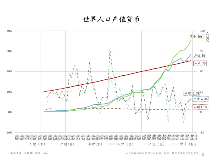 由于疫情期间的隔离对经济产生了巨大冲击,各国都在纠结这个问题;如果我们看整个过程,那么就是说经济的影响还会持续。以一年12个月计算,一个月的GDP差不多相当于8.3%;从欧美最近的一些报道也可以看出来,第一季度基本上只受了一个月的影响,GDP已经降了5%左右。如此推断,后面还要有两个月的影响,其程度或许类似估测。当然随着复工程度的不同,实际疫情对经济造成的影响也有具体的差异,有些行业的影响会小一点,不是百分之百的停转。在近期的情况下,首先当然是考虑如何应对疫情的冲击,其实各国政府需要考虑区分两个基本概念:一个是这个社会赖以生存的基础需求供应体系,其中包括必要的食品、必要的药品以及日常生活天天要用的东西;由于疫情期间阶段性的隔离、封城等措施给基础的供应体系带来了压力,如果仅仅靠市场自行重新组织供应的话,效率可能会比较低,在这个特殊的时期有很多特殊规定,所以可能最佳的方式应该是由政府积极地去参与组织基础供应的体系。通过中国前期的实践可以看出,已经做了很多这样的工作,一个系统性的体系,能够让大众生活有基础保障,也让大众能有安全的稳定的心态。另外一方面,继续实施必要的财政政策也有助于经济恢复。受疫情影响,实际上整个供应链、整个经济每一个环节都同时停了,某种意义上来说这是不可抗力,所以除了货币政策之外,实际上政府也采取了其他一些政策,比如说债务缓期,甚至比方说房租缓交,不是说不交,而是因为整个经济周期的周转就像自行车一样,你如果不断地骑,就倒不了,你只要一停,这个车就会倒掉,经济就会出现这些支付问题。但是现在的情况跟过去因为经济运转出现错误导致信用损失的情况不一样,它只是停转了。只要疫情缓解了以后重新开始营业,仍然具备挣钱的能力。因此债务缓期可能会比简单的增加贷款货币宽松更有效,当然这个政策组织起来会有一定的难度。以上说的是从短期应对疫情对经济的影响,以及保证整个社会的基本安全和稳定。我们再来看看长期的情况,在新冠疫情出现之前,世界经济已经进入历史上很特殊的时期阶段,我们从这张这张1960年到2018年的世界经济数据图可以看出总体经济是系统性的增长;但是2008年金融危机之后,为了继续保持这个增长,实际上货币(浅绿色实线)史无前例地迅速扩大,货币的增长是已经越来越超过经济总值的增长。