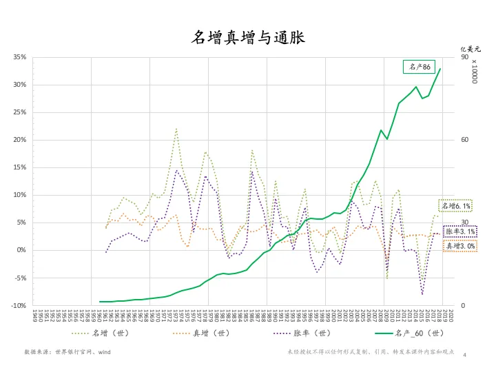 从变化率角度来讲,也就是深绿色和浅蓝色这两条虚线可以看出,货币的增长率似乎在历史上一直都跟经济的名义产值增长率非常接近甚至要更大一些。从下面名增(名义产值增长)真增(真实产值增长)与通胀这张图可以看出来,过去这60年,经济实际的增长还是保持在3%-4%之间,除了早期60年代的时候有超过5%的阶段。
