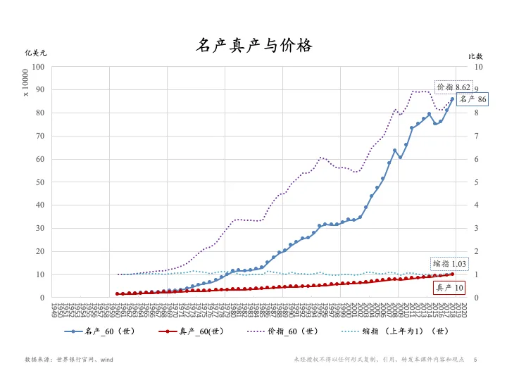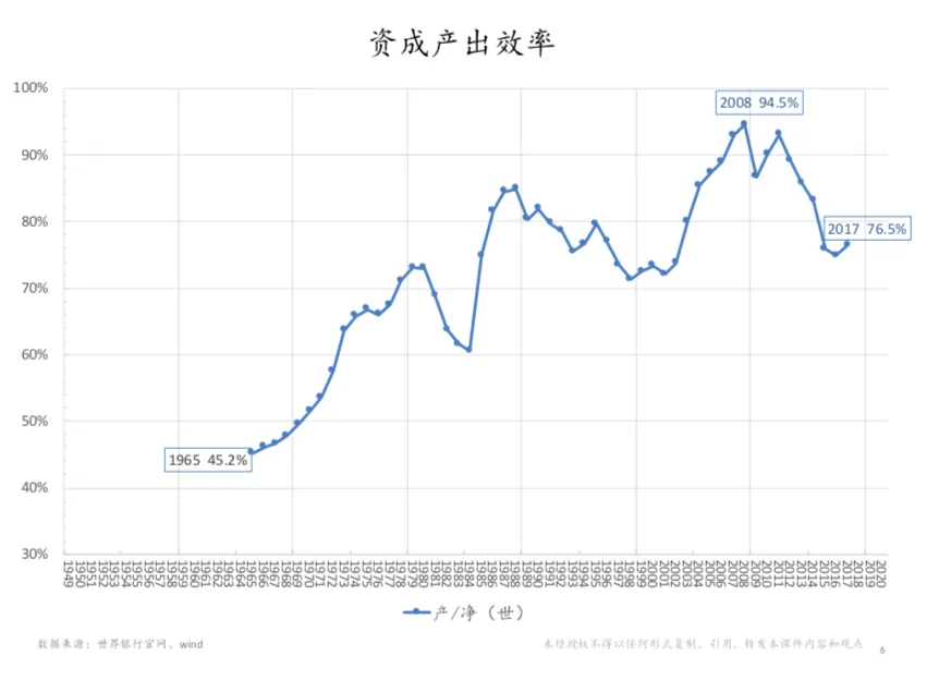 可以看出来因为货币不断在增长,所以我们的物价水平也是不断在增长,如果60年代初为100,到了70年代、80年代就跳到了300,到90年代就跳到了600,到现在差不多是900。最重要的一个问题是下一张图,就是关于资产的产出效率。我计算了一下,如果我们把历年累计投资当做一个资产,作为当年新增产值的基础,然后再用这个新增的增加值除以累计投资,最后再加上一个折旧的修正,就可以得到资产产出效率。这个指标可以反映出现有的固定资产净值产出效益。可以看出来,过去这60年有差不多3个很明显的周期,不断地从低走高,之后又开始下滑。