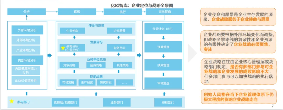 产业进程(外部分析)与企业资源(内部分析)决定了企业的定位,是企业战略的起始点,决定了企业的发展方向与作战策略,报告主要关注点聚焦于不同基因企业的基本定位与企业总体战略目标下的业务发展逻辑。企业战略是分析-解码-执行-审核复盘不断循环的进程,该流程的顺畅决定了企业战略的应变性与竞争性,而企业定位与企业愿景也将在该循环 进程中不断进化与完善。