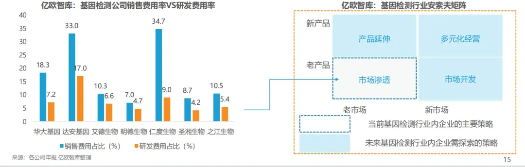 根据安索夫矩阵,亿欧智库发现当前基因检测行业内大多数企业的同质化竞争源自其产品-市场策略的单一性与局限性,未来基于新市场、新产品的产品延伸、市场开发及多元化经营将成为现有企业的破局之路。而企业如何基于外部环境及内部资源制定合适的企业发展战略,搭建合适的组织架构及人才培养机制,借助先进的技术、匹配的应用场景及创新支付模式推动企业精益经营、创新发展,推动企业破解同质化,则是当下基因检测企业急迫且需要系统性思考的问题与抉择。