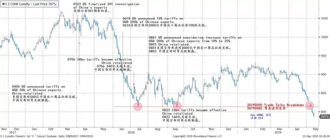 到了2018年7月份左右,美国大豆期货同时经历了两个低点。这个时候恰恰是贸易谈判在2018年最火爆的时候,一直到今年5月的第一个星期,美国大豆期货价格突然跌破了曾经非常坚实的支撑线。