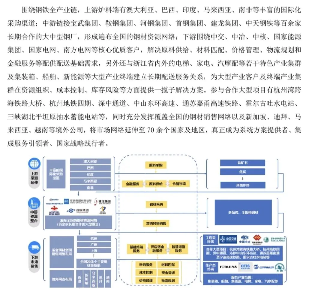 物产中大大部分的营收基本由供应链业务提供,而它模式就是向国外进口原料,然后将原料卖给中游的加工企业,随后将产出品贩卖给下游应用端;钢铁产业链是物产中大比较深耕的行业,通常一般的供应链企业就是进口原料,将原料卖给中游。
