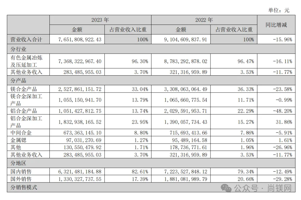 主营业务收入73.68亿元,较上年同期下降16.11%,主营业务成本为63.82亿元,较上年同期下降13.54%,主营业务毛利率为13.39%,较上年同期下降2.57%。分产品收入情况,镁合金产品28.35亿美元,占比33.4%;镁合金深加工产品10.55亿元,占比13.79%;铝合金产品10.51亿元,占比13.74%;铝合金深加工产品18.32亿元,占比23.95%;中间合金6.73亿元,占比8.8%;金属锶0.97亿元,占比1.27%。对比2022年,镁合金深加工产品和铝合金深加工产品占比分别增长了2.08和8.45个百分点。