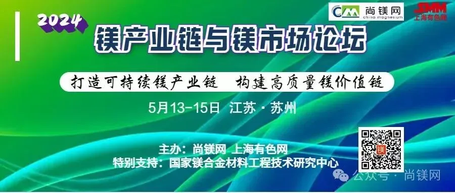 2024镁产业链与镁市场论坛将于5月13-15日在苏州举行。