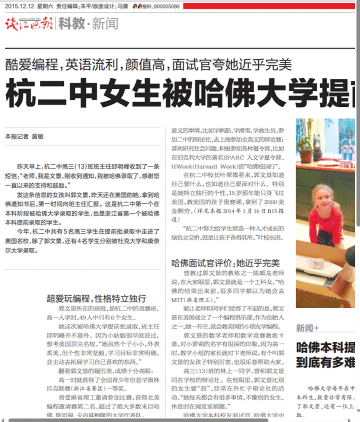 翻看郭文景的履历表,成绩十分亮眼:高一时就获得了全国青少年信息学奥林匹克联赛(浙江省赛区)一等奖。曾受麻省理工邀请参加比赛,获得北美编程邀请赛第二名,超过了绝大多数来自哈佛、斯坦福、卡内基梅隆的大学代表队。2014年、2015年连续两年参加美国国家信息学奥林匹克竞赛,都夺得冠军,其中2014年还获得了唯一的满分。另外,她还参加过中国和美国的数学竞赛,在美国数学奥林匹克夏令营中获得了最高分。