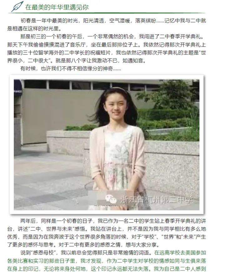 2016年,她曾寄给母校一封信《在最美的年华里遇见你》,里面写到:初春是一年中最美的时光,阳光清透,空气湿暖,落英缤纷……记忆中我与二中就是相遇在这样的时光里。那是初三的一个初春的午后,一个非常偶然的机会,我闯进了二中春季开学典礼。那天下午我偷偷摸摸混进了音乐厅,坐在最后那排位子上。我依然记得那次开学典礼上播放的三十位留学海外的二中学长的祝福短片,我也依然记得那次开学典礼的主题是“世界很小,二中很大”。就是那八个字让我激动不已,如遇知音。有时候,也许我们不得不相信缘分的神奇……很客观地说,我算不上二中天才少年中的一个。但作为二中一名普通学生的经历和直觉告诉我,每一位二中人都绝对不会输给世界上任何一所优秀学校的学生。