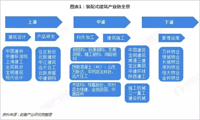 产业链重点分布于预制构件的生产环节和装配环节,其中预制构件产品可以分为钢结构产品、预制混凝土构件(PC构件)和木结构;在建筑施工领域,我国建筑业巨头中国建筑集团占据重要地位。而在产业下游,主要是进行装配式建筑的管理与运行维护,主要由物业公司进行负责,万科物业、绿城物业等具有较为明显的优势。