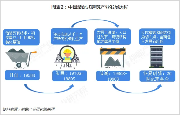 发展曲折,近年加速。虽然目前我国装配式建筑行业发展火热,但其发展过程并不是一帆风顺也不是一蹴而就的。中国装配式建筑行业已经发展了近70年,从手工作业到机械化生产、从借鉴到自我创新,有过高潮也经历过低谷。