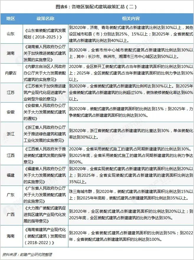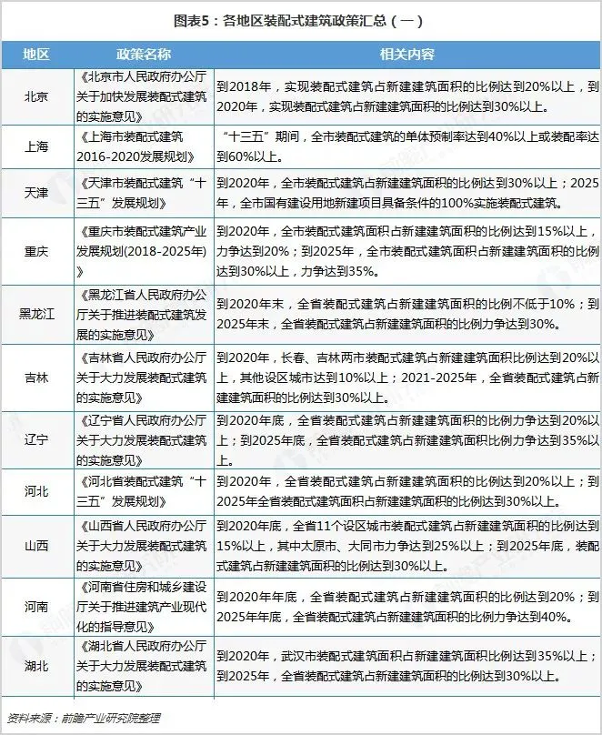 目前我国31个省市、自治区都已经制定了装配式建筑发展规划,其中北京、天津、浙江等地提出,到2020年实现装配式建筑占新建建筑面积的比例达到30%以上,高于全国目标;而海南省提出在2020年装配式建筑占比达到50%。