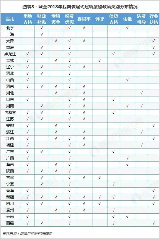 前瞻产业研究院根据我国31个省份/直辖市的装配式建筑实施意见、规划和行动方案,归纳了省级地方在装配式建筑推广方面采取的政策情况。