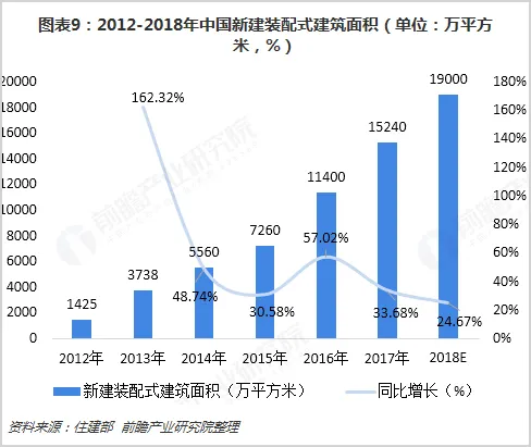 2018年,我国建筑工业化程度进一步提高,装配式建筑发展良好,全年新建装配式建筑面积约1.9亿平方米,同比增长24.67%。