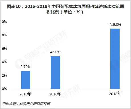 2018年,我国新建装配式建筑面积约为19000万平方米,而根据统计局数据,我国房地产新建房屋面积为209342万平方米,装配式建筑面积占比仅为9.1%,但我国城镇新建建筑面积还包括基础设施建设和市政设施的建筑面积。换言之,2018年我国城镇新建建筑面积超过2.1亿平方米,装配式建筑面积占比不足9%。